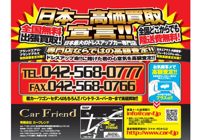 カーフレンド 東京都西多摩郡瑞穂町駒形富士山100−22 TEL042−568−0777 FAX042−568−0766 お問い合わせEメールinfo@car-f.jp PC用在庫情報http://www.car-f.jp/
